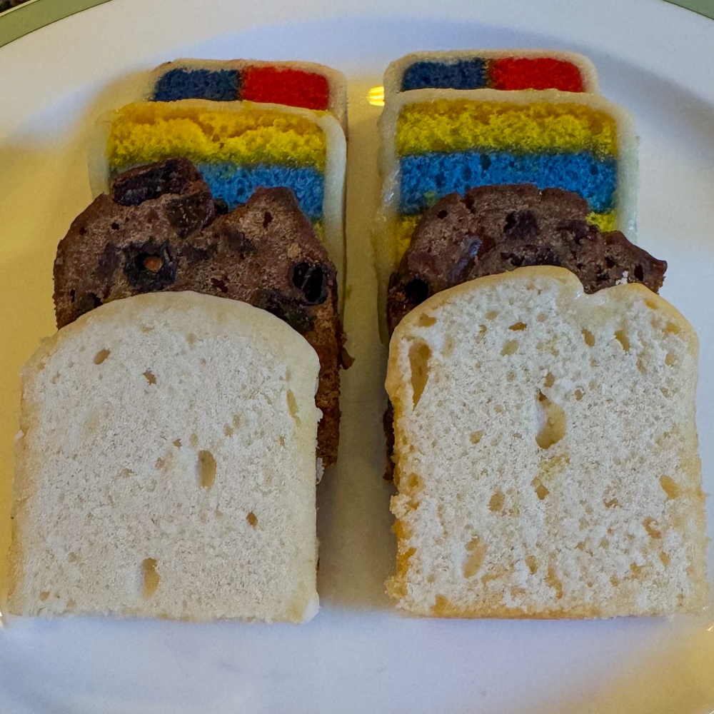 The bread and cake tiers featured warm plain and fruit scones, served with indulgent accompaniments including Glenilen clotted cream, raspberry jam, and lemon curd. The cakes were equally impressive, with a moist Portercake, a classic checkerboard Battenberg, and delicate slices of lemon bread.