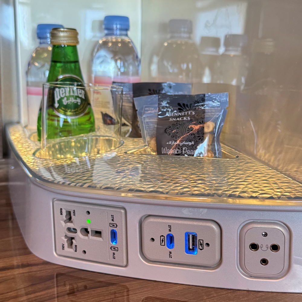 Each seat features a private mini bar with snacks like M&Ms, wasabi peas, and Haribo, as well as Perrier and Evian water, allowing guests to enjoy refreshments at any time. Snacks and drinks, including a refreshing ginger juice, are served thoughtfully throughout the flight.