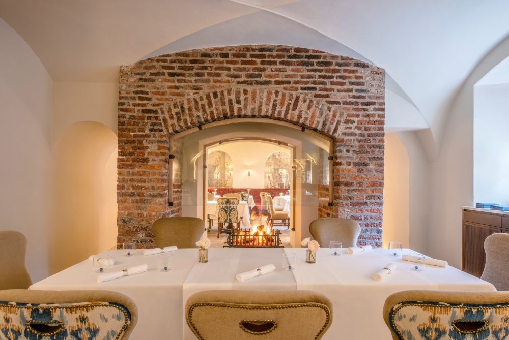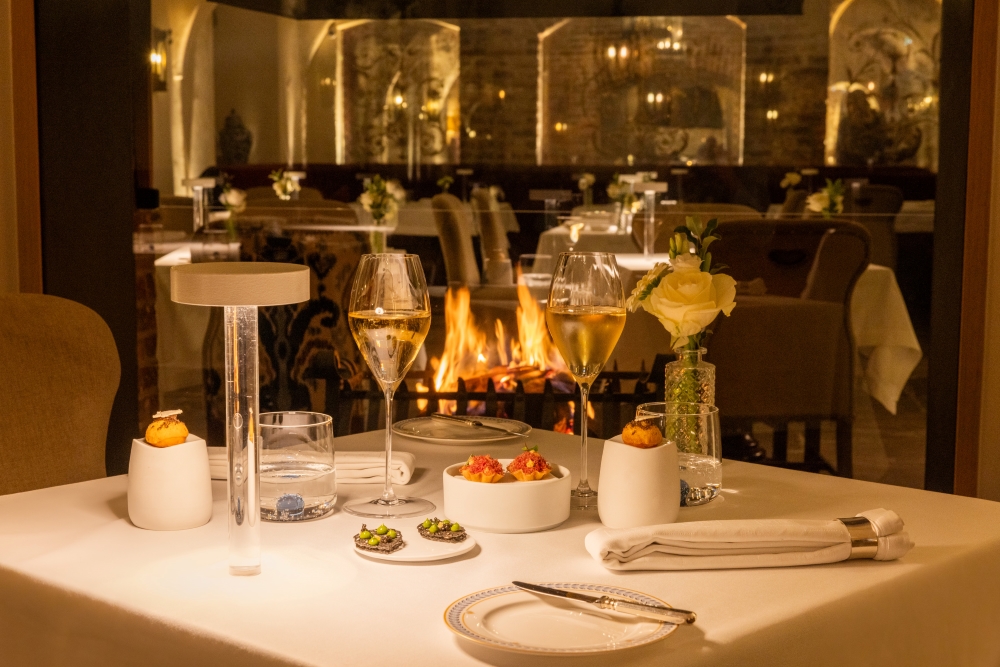 Our recent dining experience was highly impressive, delivering a well-executed and thoughtfully constructed meal from start to finish. The room combines vaulted stone ceilings with a warm, inviting atmosphere. A large open fire at the centre serves as a cosy focal point, adding to the charm of this elegant dining space. Our table was ideally situated beside the fire, and a handbag hook was thoughtfully provided.