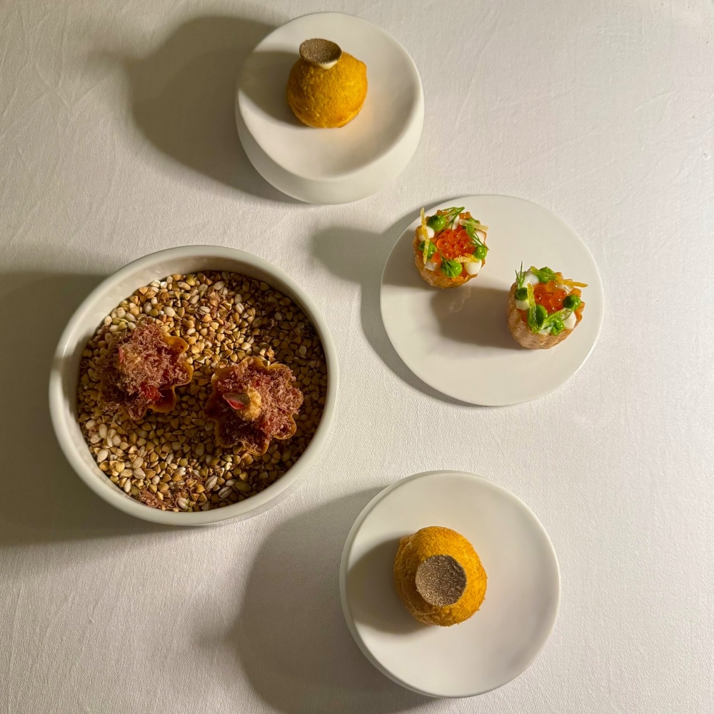 Next came the Amuse Bouche, which demonstrated remarkable skill in miniature form. The Beef Tartare Tartlet, topped with cured ox heart and a hint of smoked emulsion, was bold yet balanced. The Goujère filled with Cais na Tire custard and finished with black truffle was especially memorable.