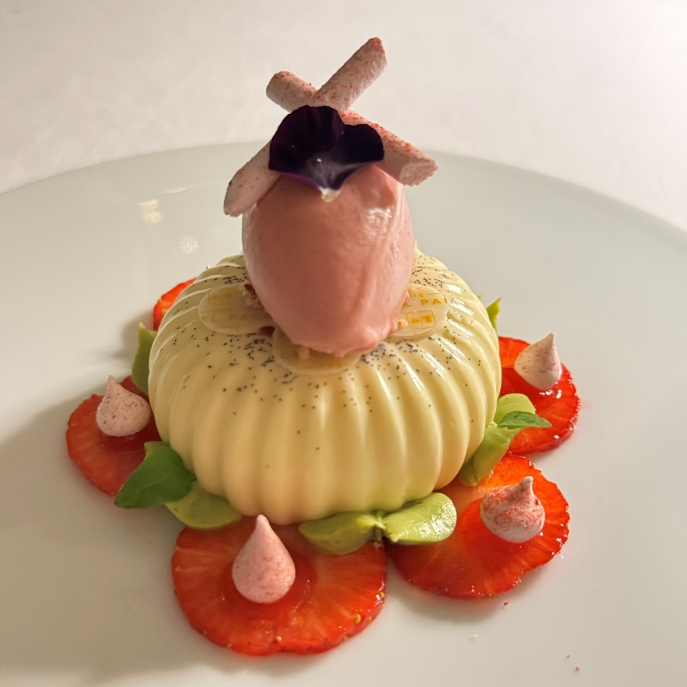 My dessert featured Tipperary strawberries, paired with silky vanilla panna cotta and a bright basil crèmeux, accompanied by strawberry ice cream and a crisp sable to provide texture and contrast.